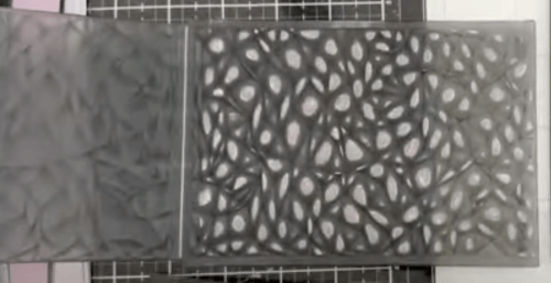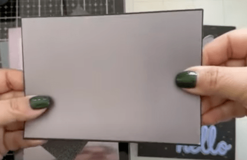 We are using the embossing folder included in the kit to add texture to the background of the card without using a machine. This will not give us the exact image but help create a pattern without making the background too busy. First, rub the pigment ink onto the one side of the embossing folder panel (I used the curved side not the pointy side). Put your card base in the folder, close it and gently apply pressure with your hands. You should have a gentle pattern of random dots as a background.