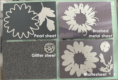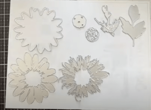 The blossom die set has 7 pieces total- 3 for the flower base, two for the flower center and two for the leaves. We are going to cut out the layers in 4 of the 5 types of opulent paper. Using opulent paper for a design like this is one of my favorites because I don’t have to think about matching all the colors since they come designed that way in the pack.