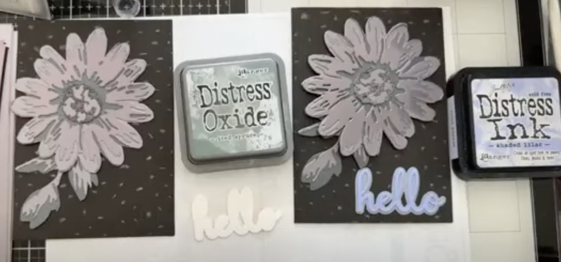 I am choosing go to iced spruce oxide and distress shaded lilac. I know it sounds weird with this opulent pack. When the charcoal layers are all together, they have this beautiful almost purple undertone. This is why I chose shaded lilac. For the outer layer of hello, I wanted to use shaded lilac but give it a grey-ish undertone so I inked the piece with iced spruce. Once it was dry I added shaded lilac on top of it. Then inked the word hello in just shaded lilac.