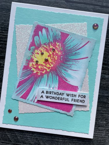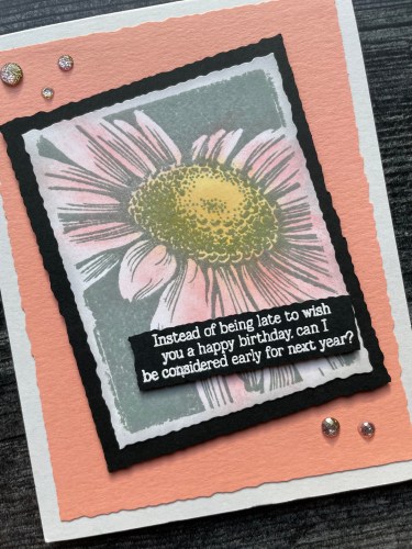This second card, I used Distress Inks’ Iced Spruce to stamp the image then with blending brushes I colored in the flower with Saltwater Taffy and Scattered Straw…and inked the edges with Lost Shadow. Adhered the floral panel on a slightly larger black panel. Embellished it with Pixie Dust Ombre Glitter Drops from Pink Fresh Studio.