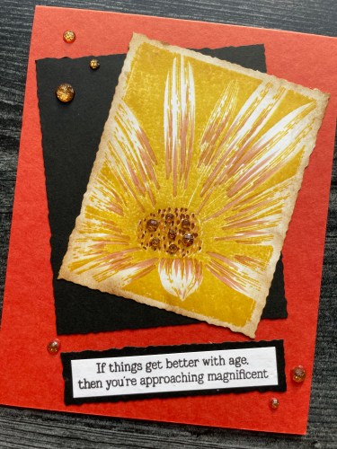 The last card, I stamped the image with Distress Inks’ Fossilized Amber and Gathered Twigs. Added flickering strokes to the petals and to the center of the flower with Copics’ Y13 and BG23. Adhered it to a larger black panel in an angle, and embellished it with Butterscotch Glitter Drops from Pink Fresh Studio.